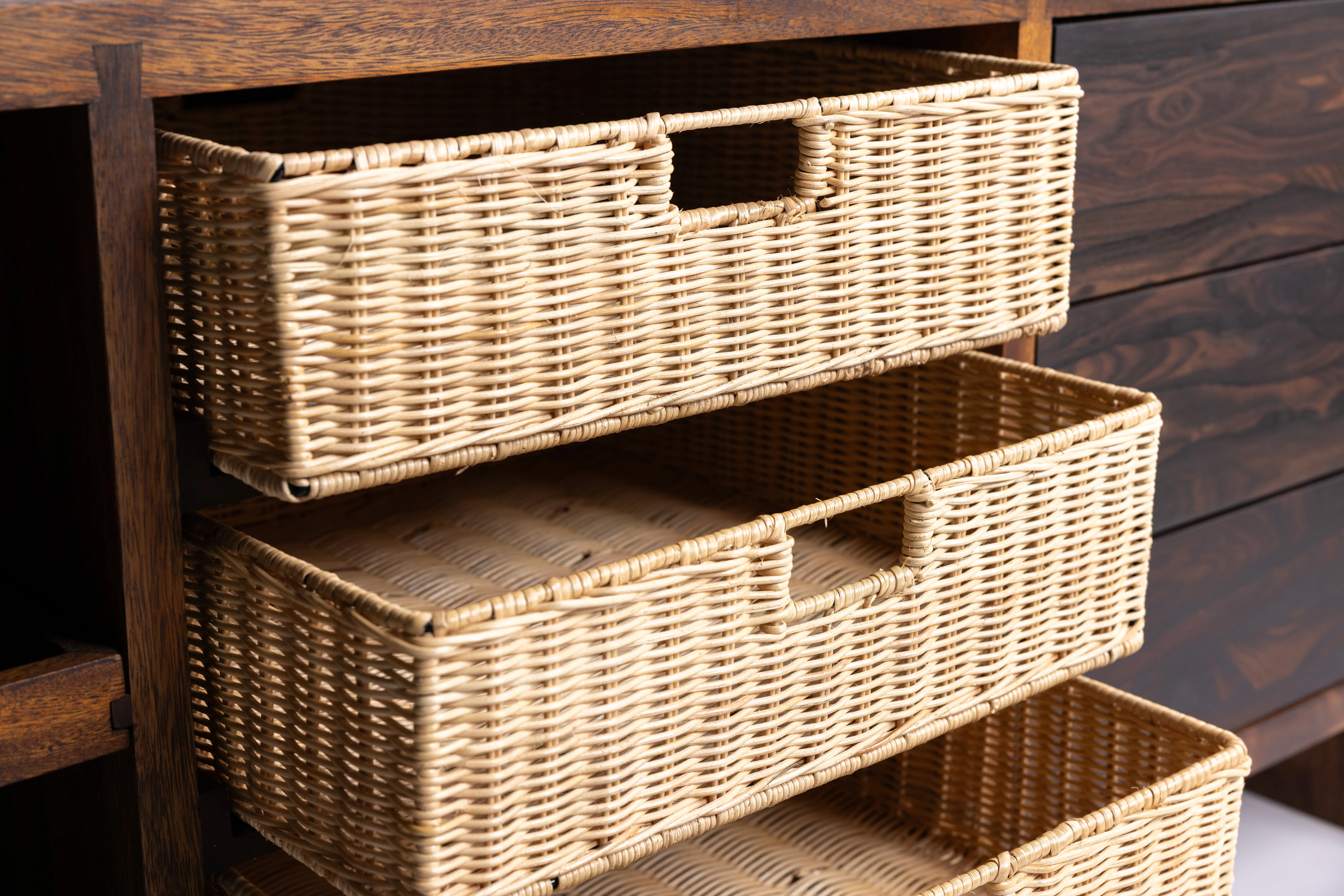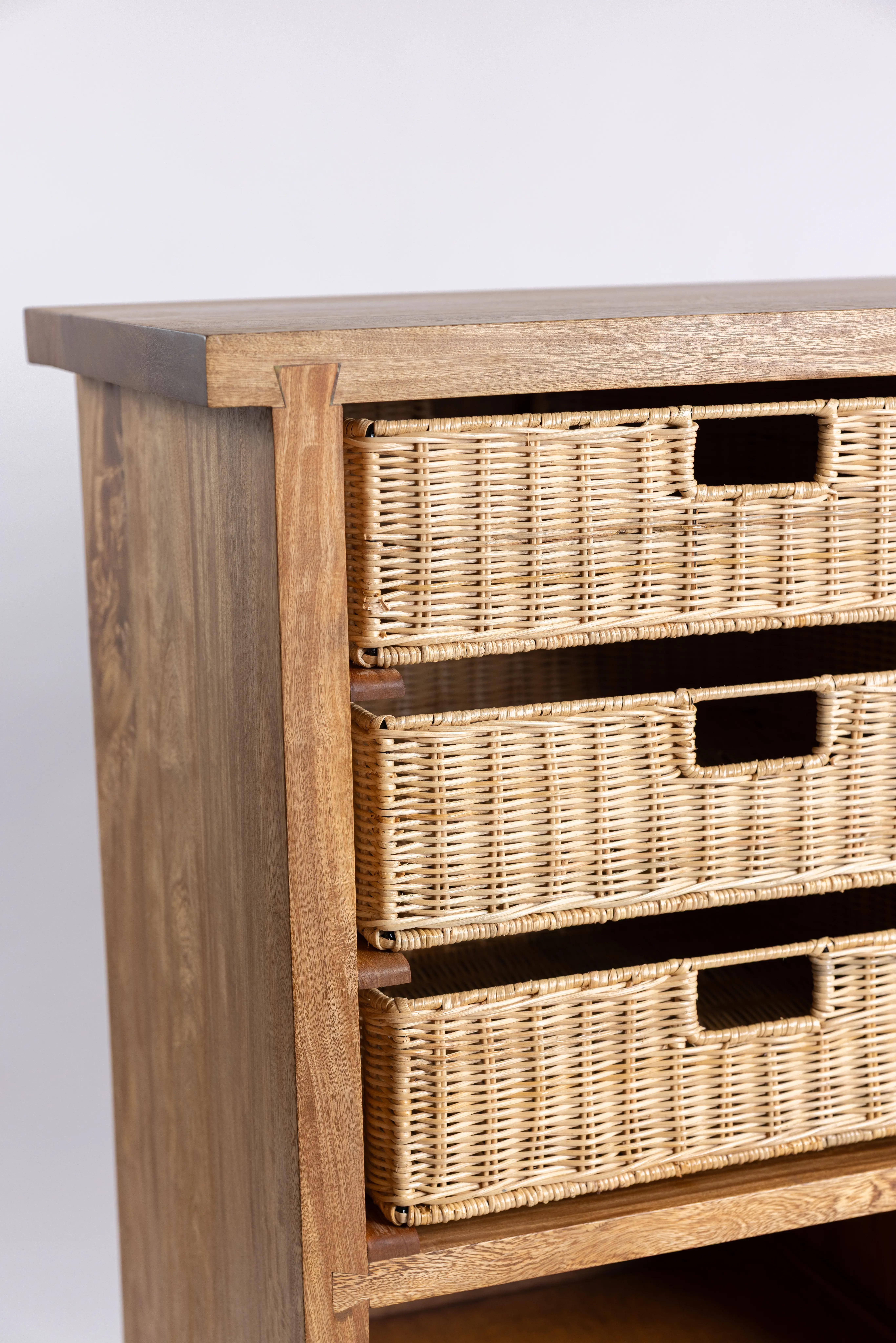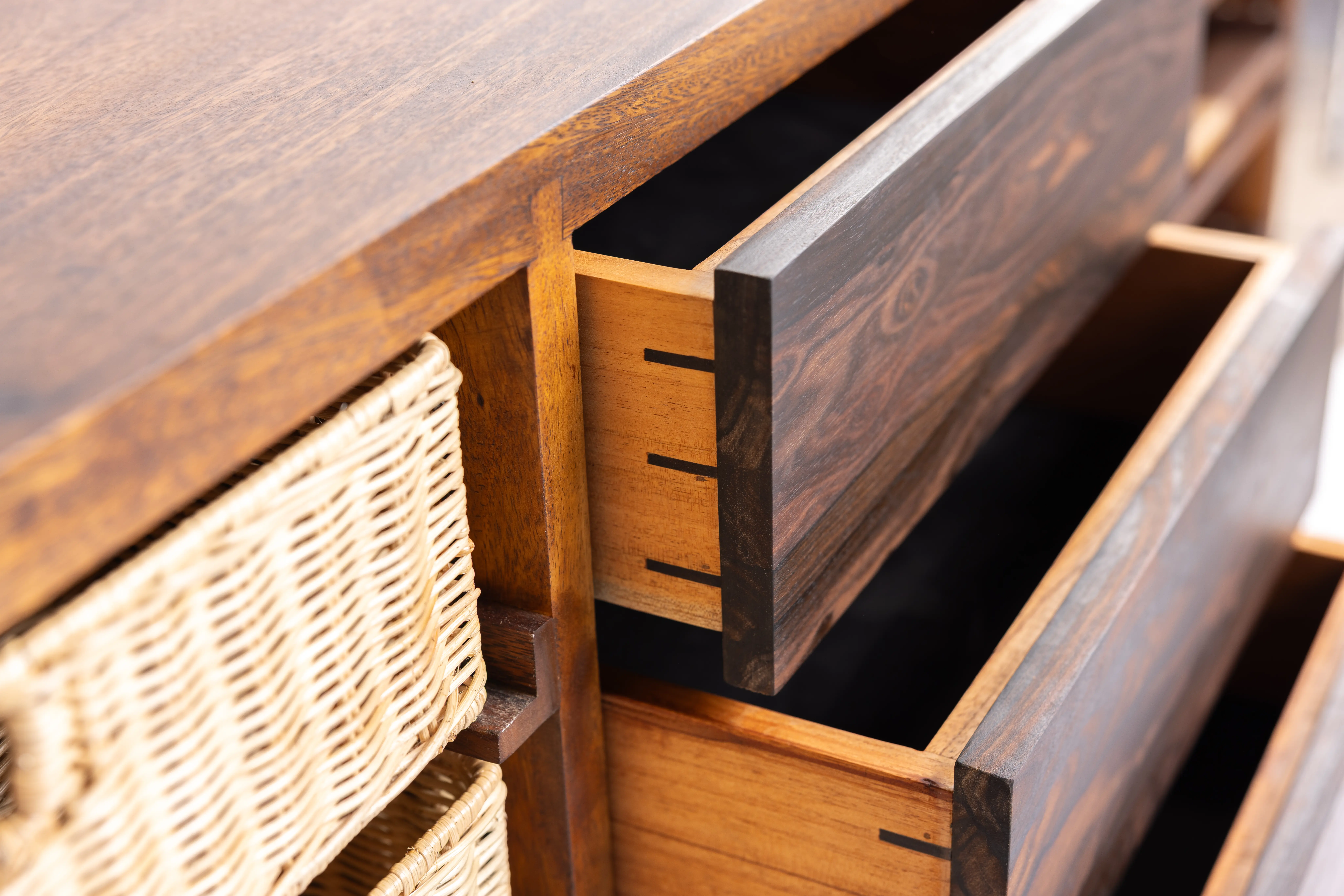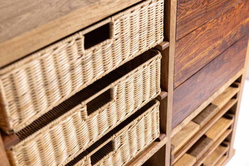Estructura en maderas seleccionadas con acabados naturales. Incorpora cajones, entrepaños y charolas de servicio, con acentos en fibras naturales y maderas.