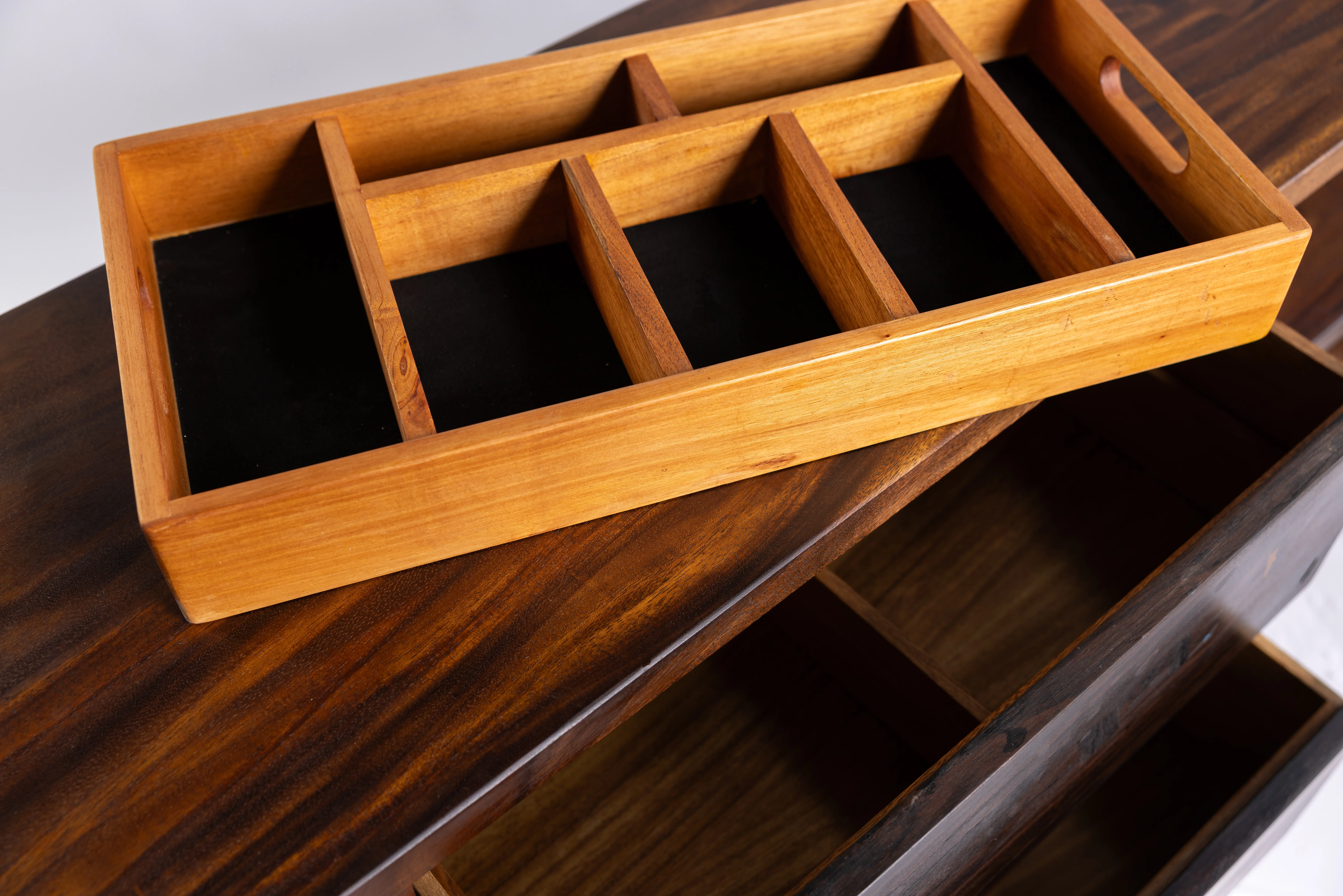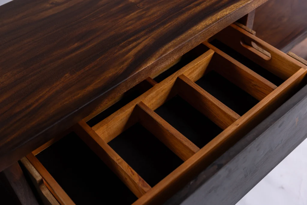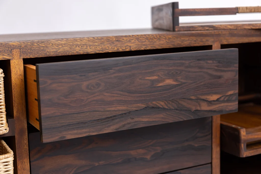 Fabricada en huanacaxtle con frentes de cajones en ziricote. Terminada con aceites naturales que realzan su veta y la profundidad del color.